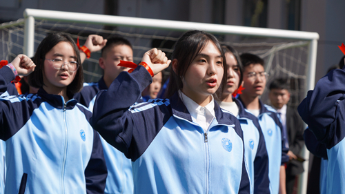 隨后,優益躍學校副校長張誠滿懷對莘莘學子的無限祝福,帶領全體奮戰在一線的教師們手舉右拳,莊嚴宣誓。