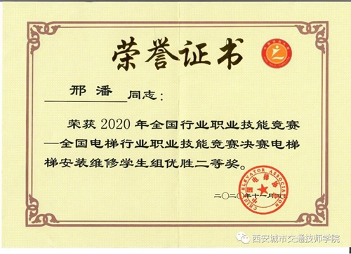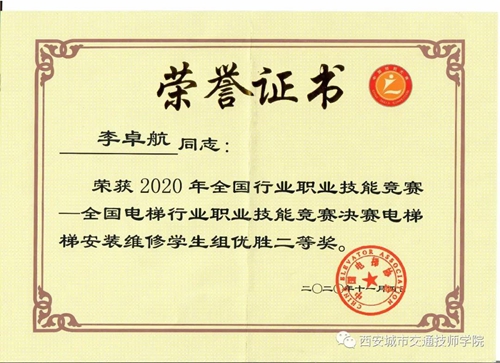 11月1日上午,一場(chǎng)國(guó)家級(jí)賽事——2020全國(guó)電梯行業(yè)職業(yè)技能競(jìng)賽決賽,在鄭州開(kāi)賽。這場(chǎng)競(jìng)賽,是今年電梯行業(yè)舉辦的規(guī)模最大、參賽范圍最廣的全國(guó)性職業(yè)技能競(jìng)賽。此次參加決賽的167名選手,是從全國(guó)10個(gè)預(yù)賽區(qū)的660名選手中選拔出來(lái)的。經(jīng)過(guò)激烈角逐,本次大賽陜西省賽區(qū)學(xué)生組的參賽選手代表——來(lái)自西安城市交通技師學(xué)院(電梯學(xué)院)的邢潘和李卓航榮獲電梯安裝維修項(xiàng)目(學(xué)生組)優(yōu)勝二等獎(jiǎng),為學(xué)院取得優(yōu)異成績(jī)做出了積極貢獻(xiàn)。