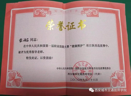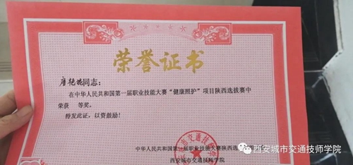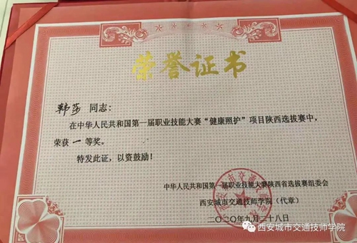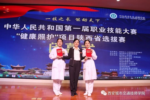 國(guó)賽精選項(xiàng)目健康照護(hù)賽項(xiàng)競(jìng)賽聚焦“健康養(yǎng)老”內(nèi)容主題,以世界技能大賽為引領(lǐng),以我國(guó)健康照護(hù)職業(yè)工匠精神為龍頭,依據(jù)養(yǎng)老護(hù)理員和健康照護(hù)師(新職業(yè))國(guó)家職業(yè)技能標(biāo)準(zhǔn)為依據(jù),進(jìn)行賽題命制和賽務(wù)組織設(shè)計(jì)。在中華人民共和國(guó)第一屆職業(yè)技能大賽“健康照護(hù)”項(xiàng)目陜西省選拔賽中,西安城市交通技師學(xué)院健康醫(yī)學(xué)院參賽選手韓莎在比賽中榮獲一等獎(jiǎng),唐艷妮榮獲二等獎(jiǎng),雷海茹老師被評(píng)為優(yōu)秀指導(dǎo)老師。