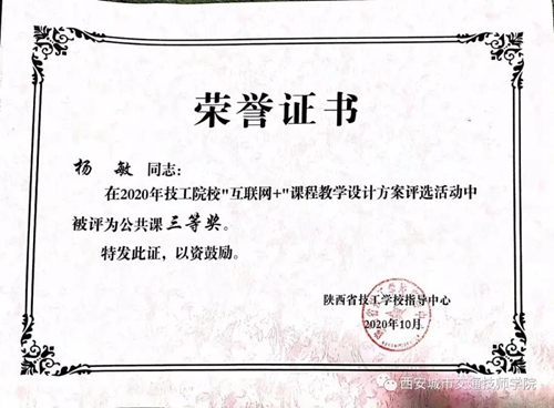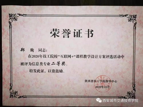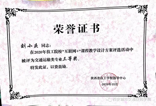 在2020年技工院校“互聯(lián)網(wǎng)+”課堂教學(xué)設(shè)計(jì)方案評(píng)選活動(dòng)中,西安城市交通技師學(xué)院教務(wù)處鄭陶老師被評(píng)為信息類(lèi)專(zhuān)業(yè)二等獎(jiǎng)、劉小慶老師被評(píng)為交通運(yùn)輸類(lèi)專(zhuān)業(yè)三等獎(jiǎng)、楊敏老師被評(píng)為公共課三等獎(jiǎng)。