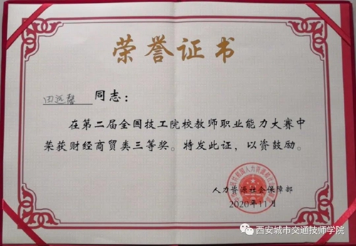 在2020年全省中等職業(yè)學(xué)校教學(xué)能手評(píng)選活動(dòng)中,經(jīng)過(guò)層層選拔,西安城市交通技師學(xué)院教師田遠(yuǎn)馨在商務(wù)禮儀學(xué)科教學(xué)展示中獲“教學(xué)能手”榮譽(yù)稱(chēng)號(hào)。