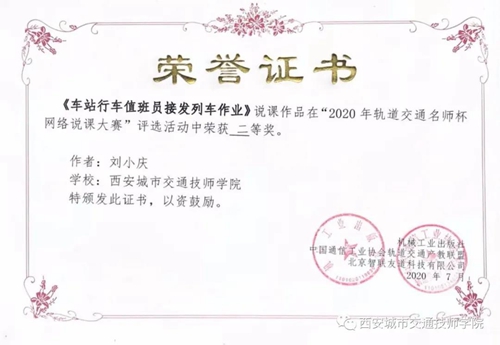 “2020年軌道交通名師杯網(wǎng)絡(luò)說(shuō)課大賽”旨在提高教師信息素養(yǎng)和信息化教學(xué)能力,為全國(guó)職業(yè)院校教師提供信息化發(fā)展應(yīng)用的展示平臺(tái)、培養(yǎng)和挖掘信息化教學(xué)浪潮中的佼佼者。西安城市交通技師學(xué)院教師劉小慶在本次評(píng)選活動(dòng)中,憑借優(yōu)秀的說(shuō)課作品榮獲大賽二等獎(jiǎng)。