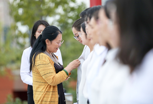 隨后,校黨委副書記、執行校長徐愛民,組織部部長黃巖及青島第五屆高校教學名師獲得者莊新穎、單菁華為新進教師佩戴校徽。