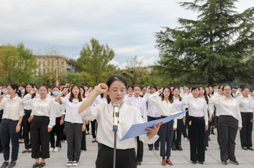 學校優秀教師代表,馬克思主義學院教師劉鎖霞領誓。全體新入職教師舉起右手面對國旗和校旗莊嚴宣誓,志愿做一名光榮的人民教師,對黨和人民的教育事業進行了莊嚴承諾。