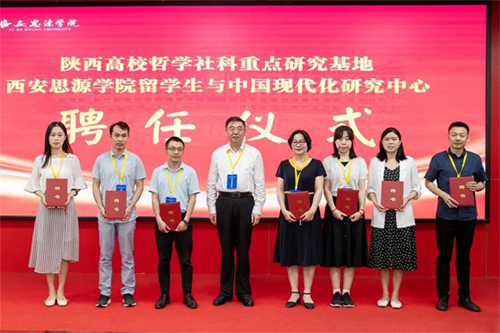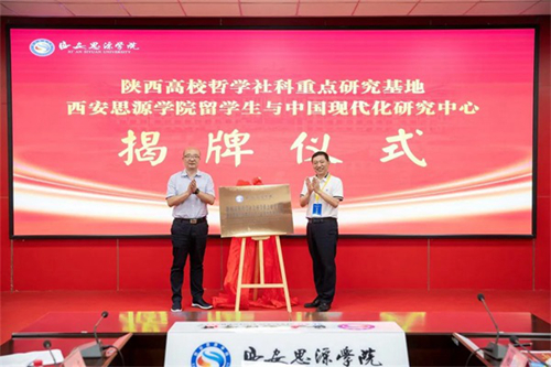 西安思源學(xué)院校長周延波和陜西省教育廳科技處處長朱曉冬共同為“陜西高校哲學(xué)社會科學(xué)研究重點研究基地西安思源學(xué)院留學(xué)生與中國現(xiàn)代化研究中心”揭牌