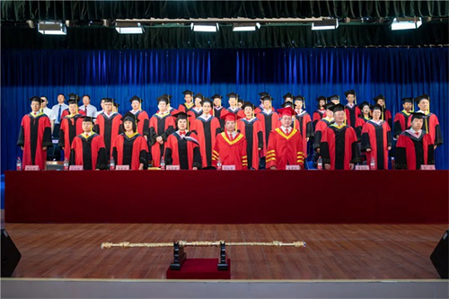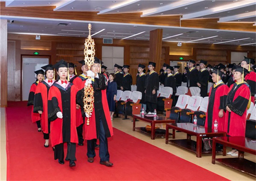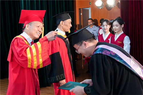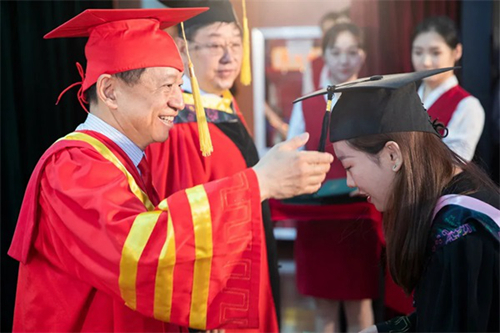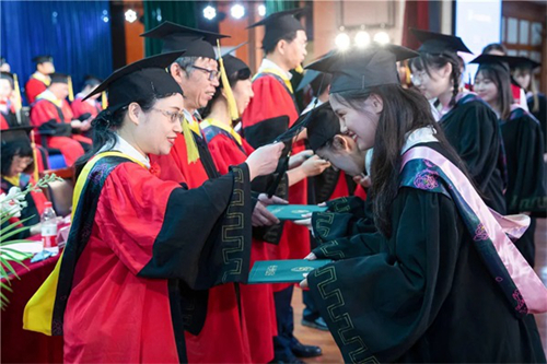 紅領黑緞,流蘇飛綠,在代表“教育的崇高和知識圣潔”的學位權杖見證下,畢業生代表一一向導師鞠躬,并從導師手中接過學位證書。主席臺一側,學生家長和師生依次迎接畢業生,獻上鮮花表示祝賀。現場氣氛隆重而感人。