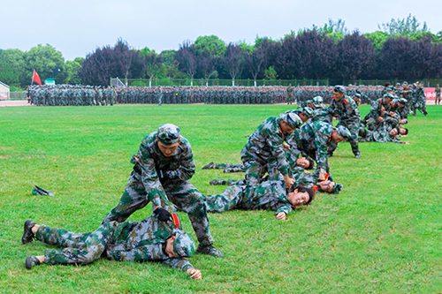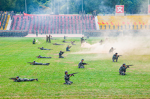匯報(bào)表演環(huán)節(jié),隊(duì)列展示、擒敵拳、戰(zhàn)術(shù)、花樣隊(duì)列等科目依次登場(chǎng)。隊(duì)列展示方隊(duì)以整齊劃一的步伐展現(xiàn)了優(yōu)秀的單兵素質(zhì),健壯有力的臂膀仿似鐵鑄,緊緊焊死在鋼槍上。擒敵拳方隊(duì)動(dòng)作鏗鏘,威風(fēng)凜凜彰顯了威武不屈的氣勢(shì)。戰(zhàn)術(shù)方隊(duì)動(dòng)作整齊、剛勁有力,體現(xiàn)了學(xué)兵們鋼鐵一般的意志。花樣隊(duì)列的3000余名學(xué)兵手持紅黃紙,在教官的哨聲下,方陣迅速變化,學(xué)兵們以整齊的步伐搭配手語(yǔ)操和舞蹈的柔美,為慶祝建黨100周年獻(xiàn)上最真摯的祝福。通過(guò)一系列戰(zhàn)術(shù)動(dòng)作表演,展現(xiàn)出思源學(xué)子颯爽風(fēng)姿。