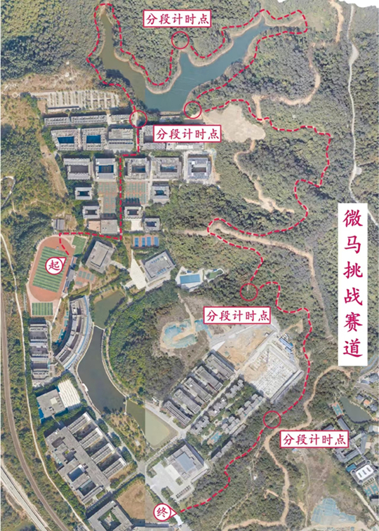 本屆微馬賽道設計別具匠心,深度融合校園景觀與競技挑戰。選手們從田徑場出發,途經三飯、四飯食堂生活區,感受濃厚的生活氣息;隨后北上繞行心形湖,在碧波微光與湖畔清風中奔跑;最后轉入東部越野賽道,直面起伏地勢與蜿蜒小徑的考驗,充分錘煉體能意志。全程4.5公里,既是一次視覺之旅,也是一次毅力之行。