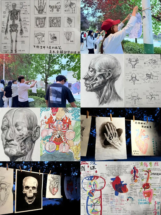 同學(xué)們畫(huà)筆如刀,繪出層層解剖真理;顏料為基,筑起巍峨醫(yī)技大廈,將嚴(yán)謹(jǐn)?shù)目茖W(xué)觀念和創(chuàng)作的藝術(shù)靈感融為一體,將抽象化為具體,不斷碰撞出醫(yī)學(xué)與藝術(shù),理性與美感的火花。經(jīng)由木夾錯(cuò)落垂懸于縱橫交錯(cuò)的麻繩裝置之上,在校園里構(gòu)筑起流動(dòng)的醫(yī)學(xué)畫(huà)卷,讓嚴(yán)謹(jǐn)?shù)尼t(yī)學(xué)知識(shí)以輕盈姿態(tài)躍入校園公共空間。
