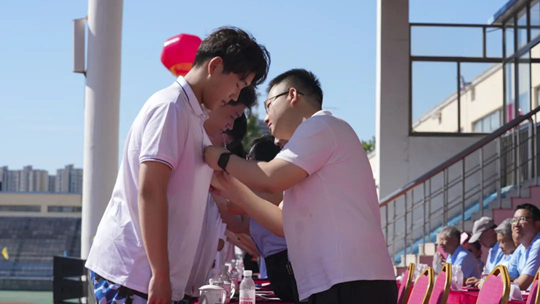 隨后,大會(huì)進(jìn)行校徽佩戴儀式,學(xué)校領(lǐng)導(dǎo)為2025級(jí)新生佩戴校徽,校學(xué)生會(huì)學(xué)生代表郭紫馨同學(xué)帶領(lǐng)全體新生宣誓。