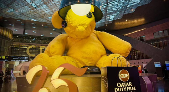 經8小時飛行,團隊于多哈哈馬德機場開啟首段國際中轉。這座連續多年獲評"全球最佳機場"的樞紐,以未來感設計與多元服務消解了長途旅行的疲憊:C區室內熱帶雨林區,師生們圍坐充電躺椅,透過穹頂玻璃仰望天空;中央大廳的巨型“KAWS公仔”與“大黃熊”(Lamp Bear)雕塑成為打卡熱點。機場全流程電子化服務令人印象深刻——自助值機、人臉識別通關、行李轉運狀態實時推送,展現了卡塔爾航空作為五星航司的硬實力。