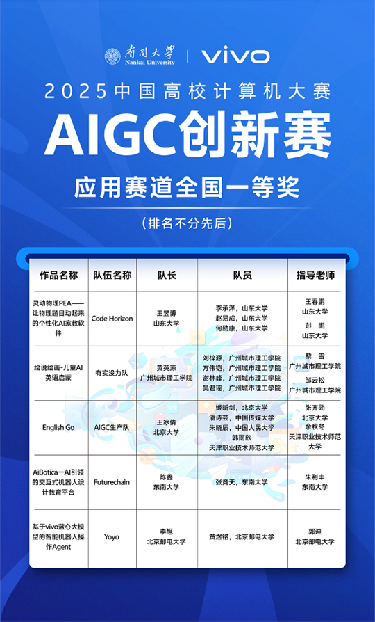 “中國高校計算機大賽”(China Collegiate Computing Contest,簡稱C4)由教育部高等學校計算機類專業教學指導委員會、教育部高等學校軟件工程專業教學指導委員會、教育部高等學校大學計算機課程教學指導委員會、全國高等學校計算機教育研究會于2016年創辦。第二屆(2025年)“中國高校計算機大賽-AIGC創新賽”由南開大學與vivo公司聯合承辦,東莞濱海灣新區管理委員會協辦。該競賽面向全國高校在校學生,以vivo自研通用大模型矩陣為技術底座,助力AIGC應用創新和內容創作,攜手青年開發者共同推動大模型前沿技術快速發展,實現AI普惠應用。本屆競賽共有來自全國多所高校的研究生、本科生及專科生同臺競技,競爭激烈。