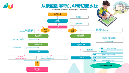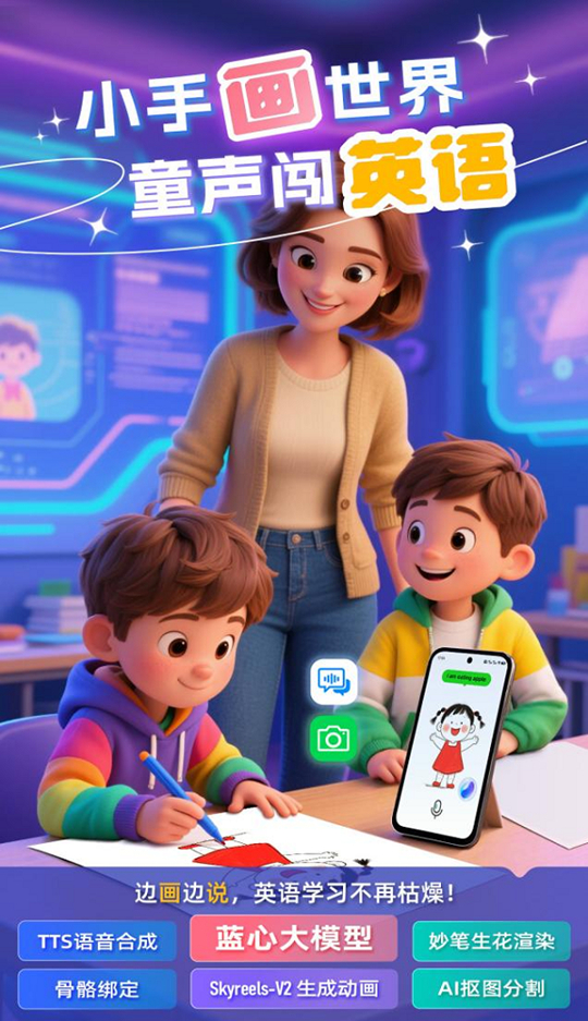 學院參賽團隊通過運用藍心大模型矩陣API,專為兒童、家長及教師量身打造了一款繪說繪畫軟件。該軟件以vivo藍心大模型作為“大腦中樞”,輔以妙筆生畫模型進行背景渲染,將小朋友的涂鴉變成動起來的故事角色,幫助小朋友愉快地學英語。藍心大模型作為核心引擎,通過專屬Prompt模板精準定位“兒童助手”角色,采用“童趣”語言風格與幼兒互動,同時提煉關鍵詞以供妙筆生畫生成角色背景,并優化劇情文本,有效彌補了傳統繪畫工具互動性不足、語言學習缺乏真實情境的短板。借助Grounded-SAM-2技術,軟件可快速分離手繪角色,再通過Animated Drawings實現角色動作綁定,Skyreels-V2引擎則負責編排生成英語情景動畫,不僅有視覺高亮、語音跟讀等功能,而且還支持智能更換背景,帶來沉浸式教育體驗。