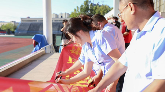 儀式第四項為簽字環節。工作人員將簽字橫幅移至主席臺前,學校領導、教師代表與學生代表依次上臺,在橫幅上鄭重簽下名字,以實際行動踐行愛國承諾。