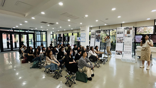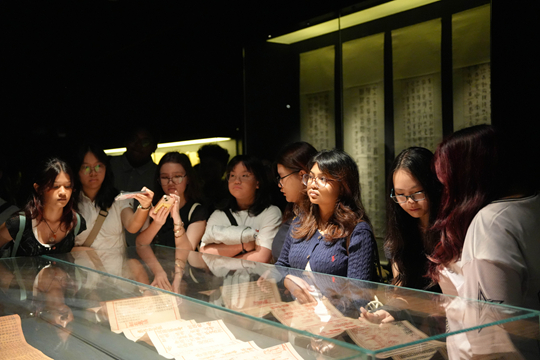 師生們緩緩前行,眼神中滿是驚嘆與崇敬。他們在一件件展品前駐足良久,那泛黃的書卷、陳舊的照片、飽含歲月痕跡的教具,無一不像是時光碎片,拼湊出學校波瀾壯闊的發展畫卷。在一個展示學校早期辦學成果的展柜前,一位學員用不太流利的中文說到:“這些珍貴的典藏,就像是一座座歷史的豐碑,見證了無數的夢想與奮斗。” 他們頻頻駐足,不僅為學校清晰的辦學理念與蓬勃的發展歷程所觸動,更對歐亞一路走來的積淀與追求表達由衷贊嘆——這是一所大學與時代同頻、以教育筑夢的生動見證。