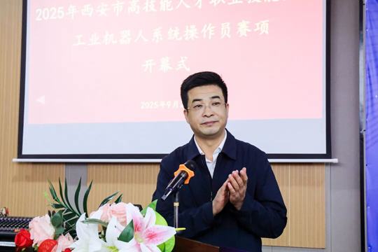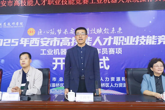 西安鐵道技師學院黨委書記、校長左永煥致開幕詞,代表學校對各位領導的支持和信任表示衷心感謝,向大賽組委會成員、各參賽隊伍及裁判專家們致以熱烈歡迎。他表示,工業機器人作為“新質生產力”的核心載體,其技術應用與人才儲備已成為衡量區域競爭力的關鍵指標。本次競賽以“匠心筑夢長安,精技賦能未來”為主題,聚焦工業機器人系統操作員賽項,精準對接《中國制造2025》戰略需求,既是落實“深化產教融合、強化技能報國”的實踐行動,也是對學校辦學辦賽實力的肯定與檢閱,同時表示將全力保障賽事,期盼深化合作共譜技能成才新篇章。