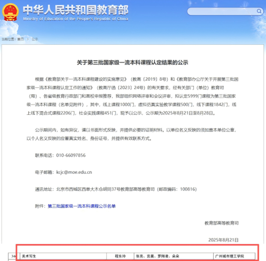 8月29日,教育部高等教育司關于第三批國家級一流本科課程認定結果公示結束,廣州城市理工學院建筑學院程東玲副教授主持的《美術寫生》課程入選國家級社會實踐一流課程,標志著學校在國家級一流課程建設領域實現“零的突破”,這也是學校堅持以人才培養為核心、深化教育教學改革的重大成果。