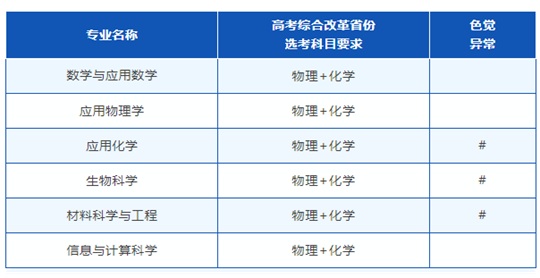 2.對考生身體健康狀況的要求執(zhí)行教育部、原衛(wèi)生部、中國殘疾人聯(lián)合會(huì)制定并下發(fā)的《普通高等學(xué)校招生體檢工作指導(dǎo)意見》中的規(guī)定。標(biāo)記“#”的專業(yè)不招收相關(guān)色覺異常(色盲、色弱、單色不能識(shí)別)考生。