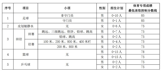3.對(duì)于達(dá)到我校文化成績(jī)和體育專項(xiàng)成績(jī)最低錄取控制分?jǐn)?shù)線的考生,我校依據(jù)上線考生填報(bào)的志愿梯次順序,根據(jù)分項(xiàng)目招生計(jì)劃按照綜合分由高到低分男女進(jìn)行錄取,綜合分相同時(shí)按體育專項(xiàng)成績(jī)擇優(yōu)錄取。優(yōu)先錄取一志愿,若招生計(jì)劃未完成,再錄取二志愿。若二志愿錄取結(jié)束后招生計(jì)劃仍未完成,我校不進(jìn)行招生計(jì)劃的調(diào)整。
