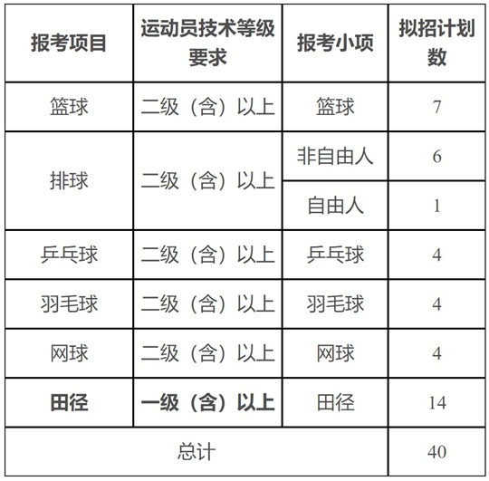 2024年運動訓(xùn)練專業(yè)面向全國招生40人,分項目擬招生計劃和運動員技術(shù)等級要求如下。