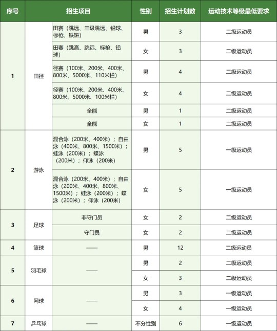 2.具備我校運動訓練專業招生項目的二級(含)以上運動員技術等級稱號(其中游泳、網球、乒乓球項目須具有一級(含)以上運動員技術等級稱號),運動技術等級證書審批日期為2015年1月1日至2025年3月10日,考生運動員技術等級以“國家體育總局運動員技術等級系統”公示的數據信息為準。籃球項目考生使用籃球或三人籃球運動員技術等級證書均可報名,按照籃球項目考試方法與評分標準參加籃球專項考試。