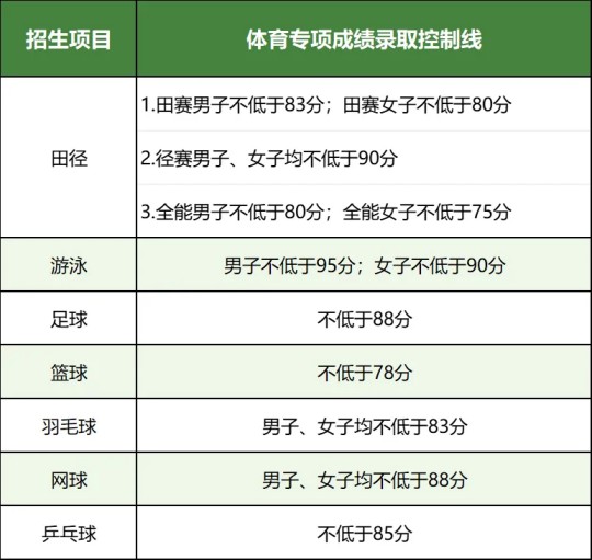 注:以上各項目體育專項成績錄取控制線均包含所述分數。