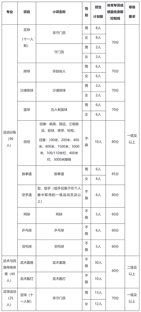 運動訓練專業計劃擬招收90人,武術與民族傳統體育專業計劃擬招收40人,足球運動專業計劃擬招收25人,合計155人(含保送錄取運動員),正式計劃以上級主管部門審批計劃數為準。
