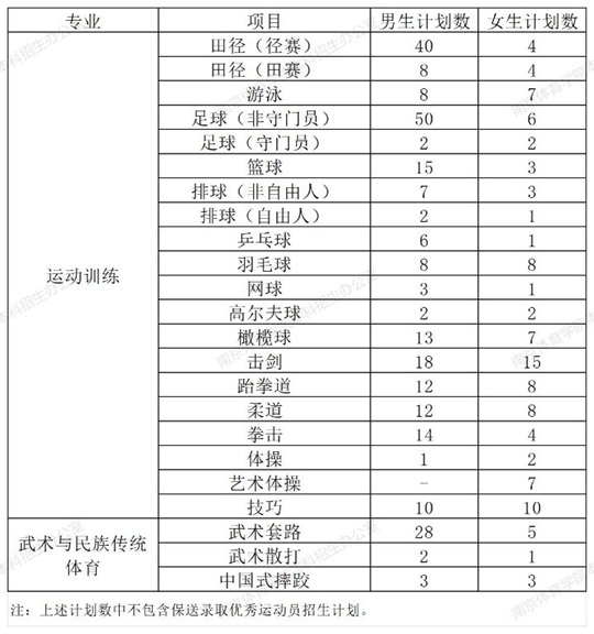 南京體育學院2025年運動訓練、武術與民族傳統體育專業分項目招生計劃