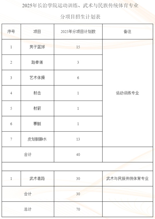 2025年長(zhǎng)治學(xué)院運(yùn)動(dòng)訓(xùn)練、武術(shù)與民族傳統(tǒng)體育專業(yè)分項(xiàng)目招生計(jì)劃表