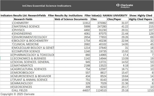 截至目前,南開大學進入ESI排名前1%的19個學科分別是化學、材料科學、物理學、工程學、環境科學與生態學、生物學與生物化學、分子生物學與遺傳學、臨床醫學、計算機科學、數學、藥理學與毒理學、經濟學與商學、社會科學總論、農業科學、微生物學、植物學與動物學、免疫學、神經科學與行為學和地球科學。其中,化學、材料科學、工程學、環境科學與生態學4 個學科進入ESI全球前千分之一。南開化學學科進入ESI全球前萬分之一。