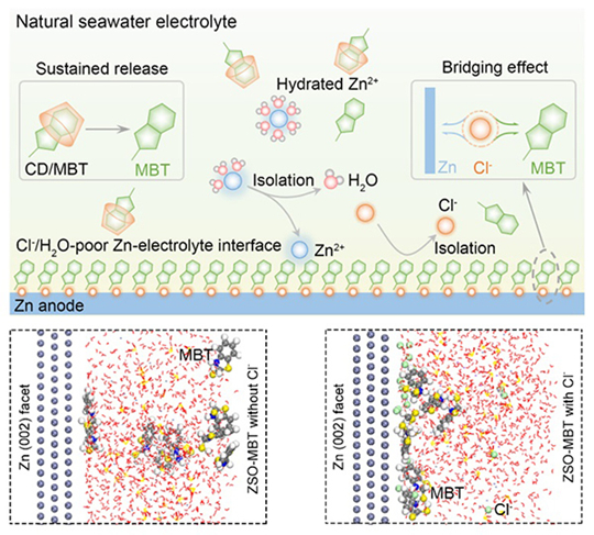 海水鋅離子電池可為海洋監(jiān)測、深海裝備及沿海可再生能源儲存提供直接、安全的能源供給,在海洋應用中具有獨特優(yōu)勢。然而海水電池中富氯/水的負極-電解液界面,給鋅金屬負極帶來嚴重的腐蝕挑戰(zhàn)。針對此挑戰(zhàn),研究團隊設計了一種含有主客體復合物添加劑的海水電解液。該電解液以2-巰基苯并噻唑(MBT)作為客體分子,借助環(huán)糊精(CD)主體實現(xiàn)緩釋控制,有效調(diào)控其在電解液中的含量。氯離子通過橋接效應在電極界面構筑出致密的MBT屏障,形成貧氯/貧水的局部微環(huán)境,顯著抑制了鋅負極的腐蝕行為,延長其循環(huán)壽命。實驗表明,鋅負極在實際放電深度42.7%的條件下實現(xiàn)了400小時以上的穩(wěn)定循環(huán);N/P比為1.92的全電池經(jīng)歷600次循環(huán)后仍保持99%的容量,安時級軟包電池初始放電容量達1.21Ah,并可穩(wěn)定循環(huán)50圈。該研究為發(fā)展低成本、實用型海水鋅離子電池提供了新思路。相關論文以“Chloride-Bridged Compact Interfacial Shielding for Practical Seawater Zinc Batteries”(氯橋接致密界面屏蔽實現(xiàn)實用型海水鋅電池)為題發(fā)表于《德國應用化學》,并被評選為“Very Important Paper”,該論文的第一作者是材料科學與工程學院2022級博士生范文杰。