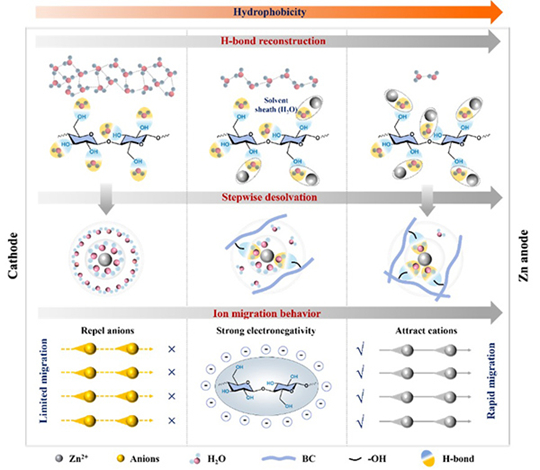 課題組還開發(fā)出一種厚度僅18μm的疏水梯度纖維素隔膜。該隔膜借助疏水梯度結構與表面負電荷的協(xié)同作用,有效阻隔氯離子滲透并降低界面水活性,不僅為水合鋅離子構建了逐步脫溶路徑,促進高聚集態(tài)電解質(zhì)的形成以抑制副反應,還通過靜電屏蔽效應排斥氯離子、均化鋅沉積,進一步提升了電池的循環(huán)穩(wěn)定性。采用該隔膜的鋅負極在天然海水電解液中實現(xiàn)了2900小時的長循環(huán)壽命,在50%放電深度下穩(wěn)定運行1300小時,所組裝的全電池體積能量密度達233.1 Wh L⁻¹(N/P=2.3)。該隔膜技術為海上儲能系統(tǒng)提供了關鍵材料支撐。相關成果以“Hydrophobicity Gradient in Ultrathin Cellulose Separators for Durable Seawater-Based Zinc Batteries”(超薄疏水梯度纖維素隔膜實現(xiàn)長效海水鋅電池)為題發(fā)表于《先進功能材料》,該論文的第一作者是材料科學與工程學院2023級博士生董艷瑩。
