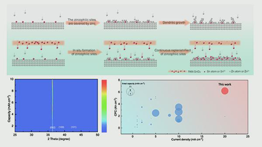 此外,課題組提出了一種動態(tài)界面合金化策略,通過可控離子釋放實現(xiàn)自適應界面調(diào)控。該策略采用氯化亞錫和聚丙烯腈靜電紡絲復合界面膜,逐步釋放亞錫離子并在負極表面原位還原形成金屬錫。后續(xù)的鋅沉積促使持續(xù)形成鋅-錫合金,不斷補充親鋅位點,誘導Zn(002)面外延生長。該合金化界面還可加速亞錫離子在局部缺陷區(qū)域的還原,引導鋅優(yōu)先沉積,修復結構完整性,從而顯著提升負極的可逆性與穩(wěn)定性。基于該策略的電池可實現(xiàn)3.5 mAh cm-2的面容量,穩(wěn)定循環(huán)超過1000次。相關研究以“Dynamic Interfacial Alloying for Highly Reversible Zinc Anodes”(動態(tài)界面合金化構筑高可逆鋅負極)為題發(fā)表于《先進功能材料》,該論文的第一作者是材料科學與工程學院2023級博士生王興杰。