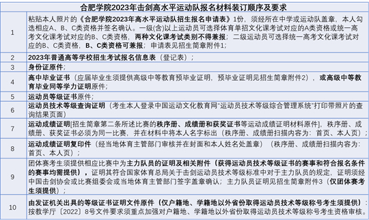 符合我校報名條件的所有考生,須提供按以下材料清單提供原件,同時將原件掃描后按目錄順序編號制成1個PDF文檔,并命名為“生源省份+運動員姓名+統一高考考生號+合肥學院擊劍高水平運動隊報名材料”(例:安徽省張**2334***合肥學院擊劍高水平運動隊報名材料):