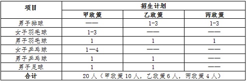 注:1.排球項目招收主攻、二傳、副攻及自由人位置,報名不分比賽位置。2.足球項目招收甲政策考生的比賽位置為中鋒,乙政策考生的比賽位置為邊前衛。根據考生測試實際水平協調各位置招生計劃、確定簽約人數。3.甲、乙、丙政策詳見本簡章“四、簽約及錄取”部分。