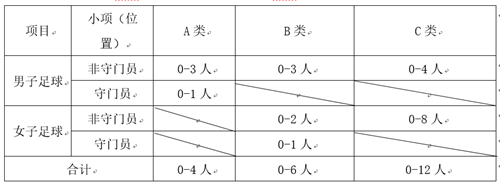 1.獲得國家二級運動員(含)以上證書且高中階段在省級(含)以上比賽中獲得集體項目前六名的主力隊員,男足守門員身高不低于1.82米,女足守門員不低于1.70米。