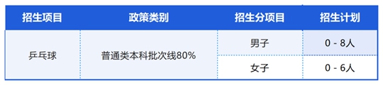 注:乒乓球項目招生計劃不超過14人,公示合格考生人數按教育部規定執行,擇優錄取、寧缺毋濫。已被有關高校運動訓練、武術與民族傳統體育專業擬錄取的考生,不再參加高水平運動隊的選拔。