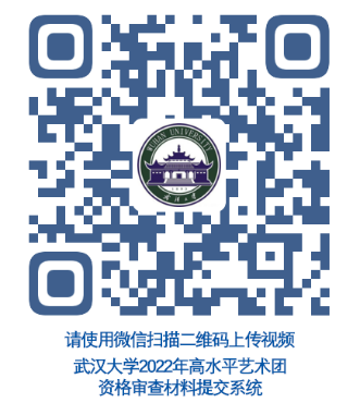 考生在教育部“陽光高考平臺”報名完成后,需在2021年12月20日10:00至12月27日16:00期間上傳音像資料。考生需將與報考項目相關的藝術特長制作成聲音、圖像清晰的MP4或AVI格式的音像資料,時長不超過10分鐘,整個錄制過程需保證真實性、原始性,不得切換鏡頭拍攝或進行后期編輯加工,不得出現任何與考生有關的個人信息;并將上述音像資料以“報名號+考試項目”的文件名上傳至武漢大學2022年高水平藝術團資格審查材料提交系統(https://whu.gaokaobaoming.com,二維碼附后)。未按要求完成報名、報名材料不符合要求、音像資料不能播放等情況,一律視作報名無效。