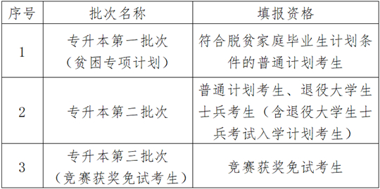 2025年我省專升本考試招生錄取實行院校專業志愿,填報志愿設置三個批次。脫貧家庭畢業生計劃考生填報第一批次志愿,普通計劃考生、退役大學生士兵考生(含退役大學生士兵考試入學計劃考生)填報第二批次志愿,競賽獲獎免試考生填報第三批次志愿。