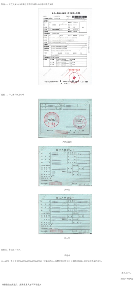 1.申請表。武漢大學2025年高校專項計劃招生申請表(網報成功后通過系統打印。報名申請表要求本人親筆簽名并承諾所提交材料真實可靠,中學負責人親筆填寫相關內容并簽字確認,中學審核蓋章)。申請表樣表及相關說明見附件一。