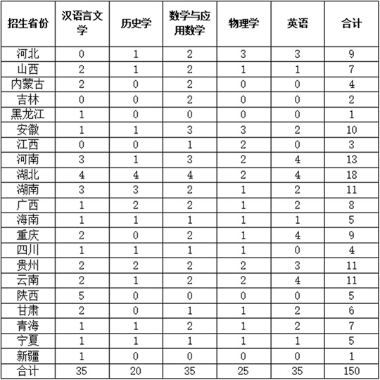 1.招生專業。漢語言文學、數學與應用數學、英語、物理學、歷史學5個專業。