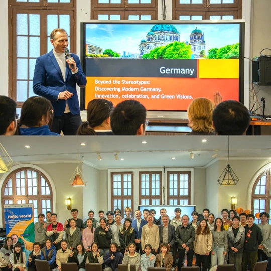 Innovation, Celebration, and Green Visions)為主題,引領(lǐng)大家走進(jìn)一個充滿活力與創(chuàng)意的現(xiàn)代德國。他通過展示德國壯麗的自然風(fēng)光、德語的獨(dú)特魅力、當(dāng)?shù)刎S富多彩的嘉年華和音樂節(jié)等文化元素,逐步改變同學(xué)們對德國人“嚴(yán)肅”“古板”的傳統(tǒng)印象。克里斯蒂安老師以其風(fēng)趣幽默的語言風(fēng)格使活動現(xiàn)場充滿歡聲笑語,他還邀請學(xué)生體驗(yàn)德國傳統(tǒng)習(xí)俗,通過請同學(xué)上臺體驗(yàn)剪領(lǐng)帶、向觀眾席拋撒糖果等,為參與者們帶來了一場別樣的視聽體驗(yàn),讓大家重新認(rèn)識了多元、開放、充滿活力的現(xiàn)代德國。