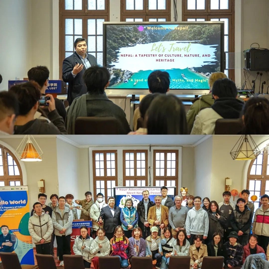 來自尼泊爾的會展經(jīng)濟(jì)與管理專業(yè)講師阿賈亞·沙迦(Ajaya Shakya),以“尼泊爾:文化、自然與傳承的織錦”(Nepal: A Tapestry of Culture, Nature, and Heritage)為主題,向同學(xué)們展示了尼泊爾美麗的自然風(fēng)貌和獨(dú)特的人文特征。他不僅詳盡地介紹了尼泊爾的地理環(huán)境、民族構(gòu)成、傳統(tǒng)節(jié)日以及壯麗的自然風(fēng)光,還熱情地分享了當(dāng)?shù)刎S富多彩的美食文化,讓在場師生身臨其境領(lǐng)略到了尼泊爾這個神秘國度的非凡魅力。在講述尼泊爾獨(dú)特民族音樂時,阿賈亞老師邀請全場師生起立,隨著美妙旋律共舞,將現(xiàn)場氛圍推向了高潮。