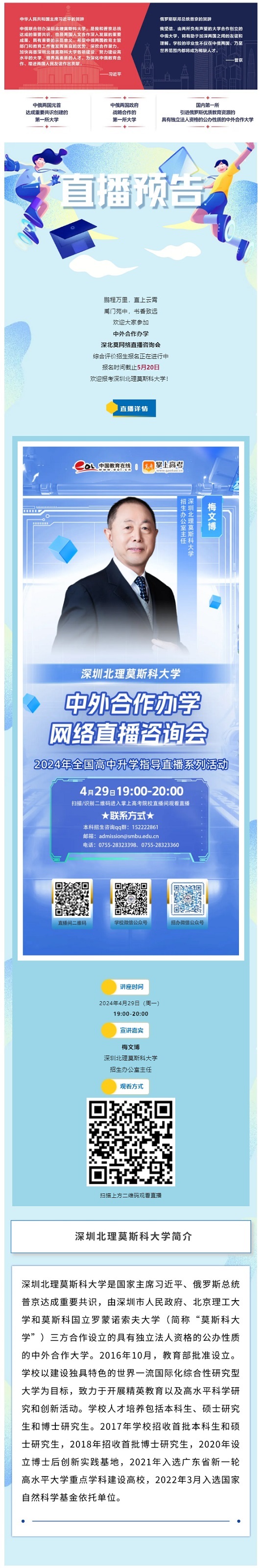 直播預告 | 深圳北理莫斯科大學中外合作辦學2024網絡直播咨詢會(4月29日)