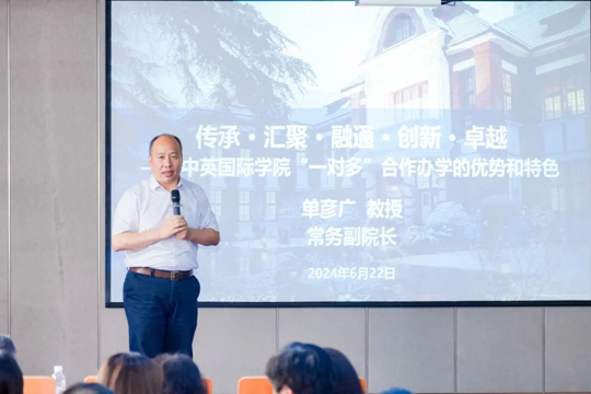 單彥廣教授作了題為《傳承•匯聚•融通•創新•卓越——中英國際學院“一對多”合作辦學的優勢和特色》的講座,就學院歷史沿革、辦學模式、辦學特色、學術科系、專業設置、國際認證、人才培養和學生發展等情況做了介紹。他表示,中英國際學院沿襲“德文醫工學堂”百年文脈、傳承學校工科教育典范、匯聚中外優質教育資源、融通中英管理運行體制、創新人才培養模式機制,培養了一批富有家國情懷、具有全球視野和跨文化溝通能力的國際化人才。2006年建院至今,學院積極推動中英兩國院校間高水平國際合作和學生交流,走出了一條獨具特色的國際化高質量發展之路,充分發揮了中外合作辦學示范引領和輻射帶動作用。