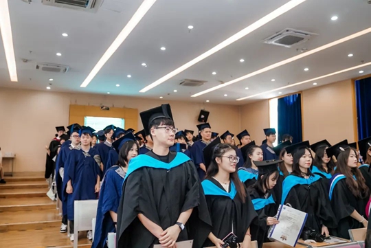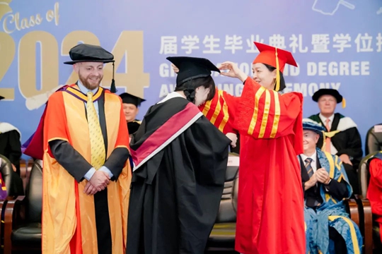 學位授予儀式上,中英國際學院常務副院長單彥廣宣讀畢業生名單。中英雙方院校領導為畢業生逐一撥穗正冠、握手勉勵,并與畢業生合影留念。學術導師和專業負責人為畢業生頒發證書。
