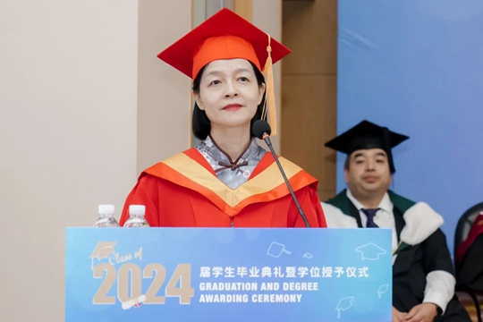 副校長、中英國際學院院長蔡永蓮講話,她代表學校向圓滿完成本科階段學習的同學們表示誠摯的祝賀和良好的祝愿,并向一直支持和陪伴同學們成長的教師和家長們致以深深的敬意。她回顧了過去四年學院的改革與發展,以及同學們在此期間的成長和所取得的榮譽。她表示,在這四年里,同學們見證了學院始終堅持“責任領導力、創業與創新、文化同理”三大核心育人理念的卓越辦學實力和顯著育人成效。學院全體教職員工與同學們并肩奮斗、共同成長,成為彼此生命中重要節點的見證者。面對即將步入社會的中英國際學院學子們,副校長蔡永蓮語重心長地向所有畢業生提出三個期望:一是希望同學們踐行“知行合一”,書寫拼搏奮進的人生本色;二是希望同學們緊跟“時”“勢”脈搏,塑造開放包容的人生底色;三是希望同學們不斷拓寬國際視野,綻放美美與共的人生彩色。最后,蔡永蓮衷心祝愿畢業生同學們在時代洪流中展青春之美、鑄時代之夢,成就更好的自己。