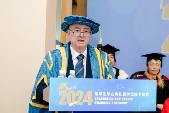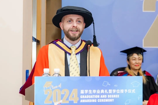 中英國際學院執行院長Rupert Ward致歡迎辭,他在致辭中表示:“撥穗正冠,寄托著學院和教師們的期待與希冀;獲得學位,象征著同學們開啟新的人生啟程。這些榮譽將是同學們未來就業、學習和生活中最堅實的基石。畢業典禮標志著一個階段的結束,但也是一個新旅程的開始。希望同學們始終保持對新知識的熱愛和執著,不斷學習和探索,勇于創新和實踐,以實際行動詮釋終身學習的深刻內涵。”