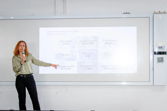 為深化師生對可持續(xù)發(fā)展與循環(huán)經(jīng)濟(jì)的理解,克里斯蒂安老師邀請上海可持續(xù)發(fā)展企業(yè)的顧問丹妮拉(Daniela Essenpreis)開展專題講座。丹妮拉系統(tǒng)地比較了傳統(tǒng)線性經(jīng)濟(jì)的“資源—產(chǎn)品—污染排放”模式與循環(huán)經(jīng)濟(jì)的“資源—產(chǎn)品—再生資源”模式的本質(zhì)區(qū)別,指出這一轉(zhuǎn)變不僅是生產(chǎn)方式的革新,更是思維理念的升級。她向同學(xué)們介紹了生命周期清單(LCI)工具,深入解析了產(chǎn)品或服務(wù)在整個(gè)生命周期對環(huán)境的潛在影響。同時(shí),丹妮拉借助豐富的案例,生動(dòng)闡釋了循環(huán)經(jīng)濟(jì)對企業(yè)實(shí)現(xiàn)“凈零”目標(biāo)的重要意義,以及企業(yè)踐行循環(huán)經(jīng)濟(jì)模式的必要性與效益。