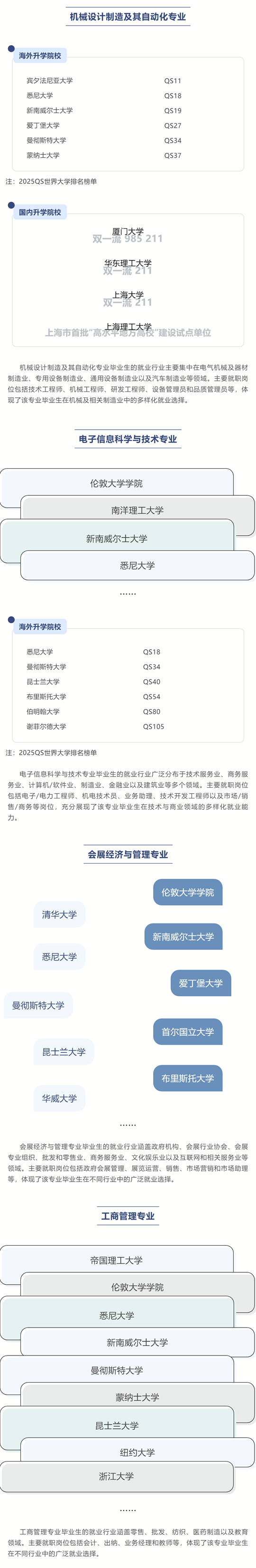 各專業升學亮點頻現,充分展現了學院在多學科領域的深厚底蘊與育人成果,涵蓋從理工科前沿科技到商科等多個領域。例如:機械設計制造及其自動化專業中,選擇境外升學的畢業生100%進入世界排名前100的院校;電子信息科學與技術專業中,80%選擇境外升學的畢業生進入英國高校;會展經濟與管理專業中,超過50%的畢業生成功進入世界排名前100的院校;工商管理專業同樣表現亮眼,65.25%的畢業生選擇繼續深造,且全部升入了世界排名前100的院校。